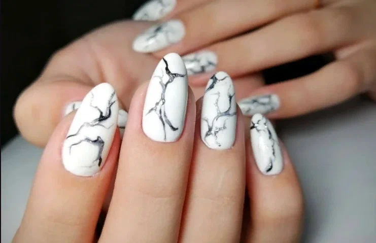 Це один з найрозкішніших різновидів манікюру. Ця техніка імітує димчасті розводи, які можна побачити на зрізі мармуру. Таке посилання до натурального каменю робить манікюр вишуканим та благородним. Можна використовувати чорно-білу гаму або нюдові відтінки.
