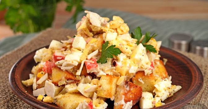 Салат з крабовими паличками, сиром, яйцями та сухариками