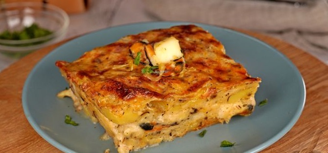 Запіканка за цим рецептом виходить дуже смачною. Обов’язково приготуйте її для гостей. Картопляна запіканка з морепродуктами має апетитний вигляд. А ще вона дуже ситна.