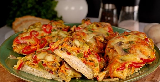 Смажені овочі з грибами викладаємо на куряче філе. Зверху посипаємо рештою сиру та ставимо в духовку. Куряче філе запікаємо 40 хвилин при температурі 180 градусів. Смачного!