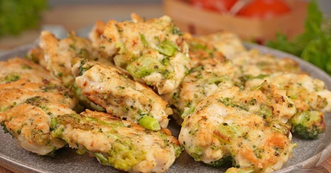Броколі дрібно нарізаємо та викладаємо в миску. Також подрібнюємо часник. Додаємо до броколі. Куряче філе нарізаємо дрібними кубиками. З’єднуємо його з рештою інгредієнтів. Потім додаємо яйце та борошно. Всипаємо сіль, перець та італійські трави.