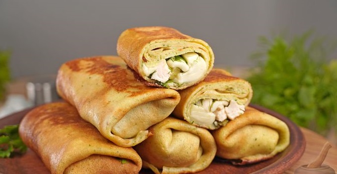 Такі млинці чудово смакуватимуть на сніданок. Вони прості у приготуванні та дуже ароматні. Млинці складаються з ситної начинки. Вони апетитні на вигляд та ситні.