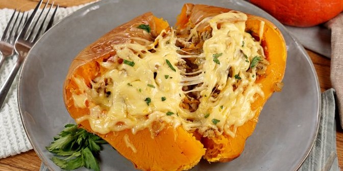 Запечений гарбуз розрізаємо навпіл. Фаршируємо його готовою начинкою, а зверху посипаємо тертим сиром. Ставимо в духовку та готуємо ще 15 хвилин. Смачного!