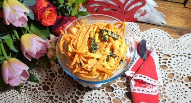 Страва має ніжний смак та апетитний вигляд. Цей салат готується надзвичайно просто та швидко. Він виходить ситним й ароматним.