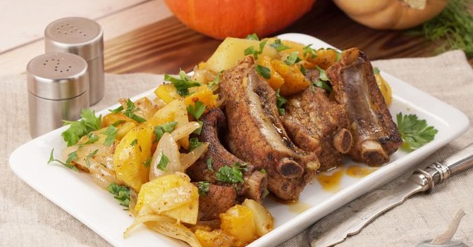 Страва дуже смачна, тому обов’язково подавайте її до святкового столу. Свинячі реберця, запечені з картоплею та гарбузом, апетитні на вигляд та нереально ситні.
