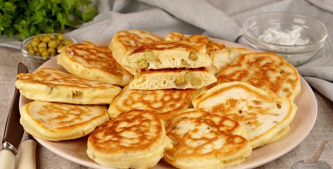 Для приготування таких оладок знадобиться дуже мало часу. На вигляд вони виходять смачними й апетитними. Оладки із зеленим горошком точно Вам сподобаються. Вони чудово смакують на сніданок зі сметаною.