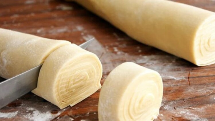 Далі в натерте масло всипаємо сіль, сухі дріжджі, вливаємо крижану воду і швидко замішуємо тісто. Тісто має вийти середньої щільності. Замісивши, прибираємо його в холодильник на півгодини.