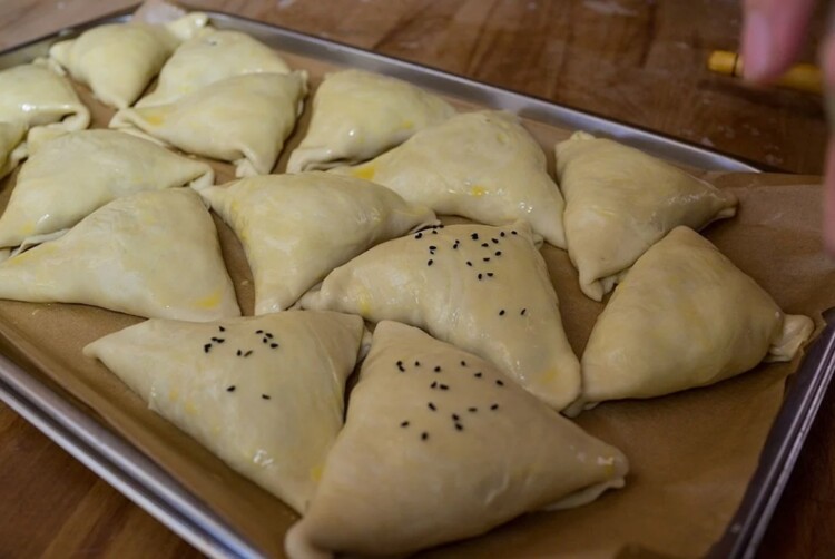 Тепер духовку розігріваємо до 180 градусів, деко змащуємо маслом і викладаємо на нього самсу. Змащуємо її збитим яйцем і ставимо в духовку.
