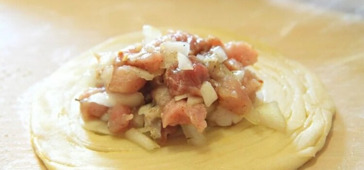 Далі розкачуємо тісто на тоненькі кружечки розміром з блюдце. На тісто кладемо трохи фаршу і заліплює краї в формі трикутника.
