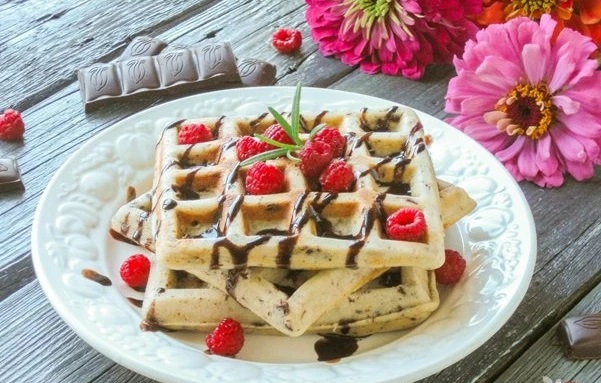 Тим часом чорний шоколад перетворюємо на крихту. Додаємо його в тісто та перемішуємо. Вафлі готуємо у вафельниці. До столу їх подаємо теплими. Смачного!
