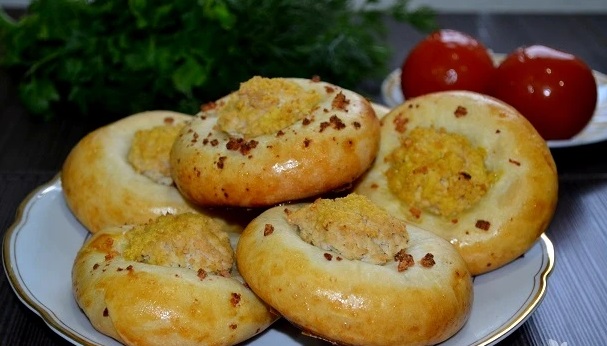 Викладаємо туди фарш. Булочки змащуємо яєчним жовтком та випікаємо в духовці при температурі 200 градусів. До столу подаємо їх в теплому вигляді. Смачного!