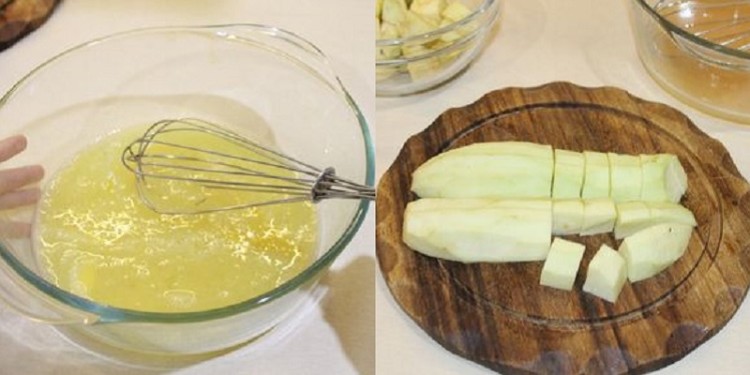 Віничком перемішайте яйця, приправивши сіллю і перцем. Баклажани очистіть від шкірки і поріжте великими кубиками. Перекладіть баклажани до яєць, ретельно перемішайте.