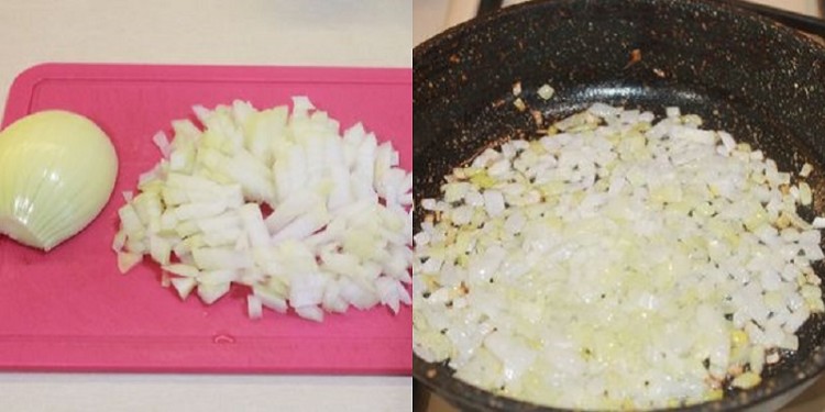 Наріжте цибулю, як вам подобається. Розігрійте на сковороді олію і обсмажте цибулю до золотистого кольору. Потім перекладіть її в піалу. Петрушку і часник подрібніть.