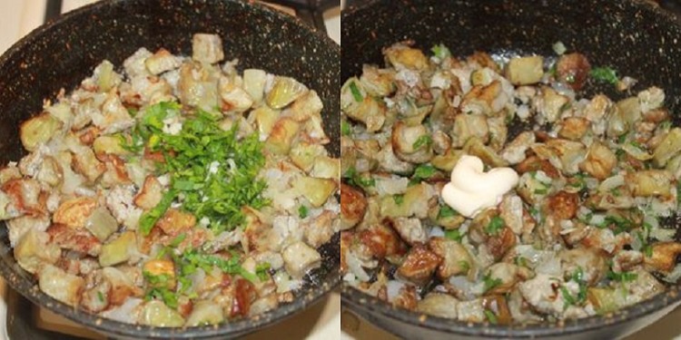 Останніми додайте петрушку і часник, перемішайте і знімайте з вогню. За смаком можете додати ложку майонезу або сметани. Перемішайте і подавайте до столу.