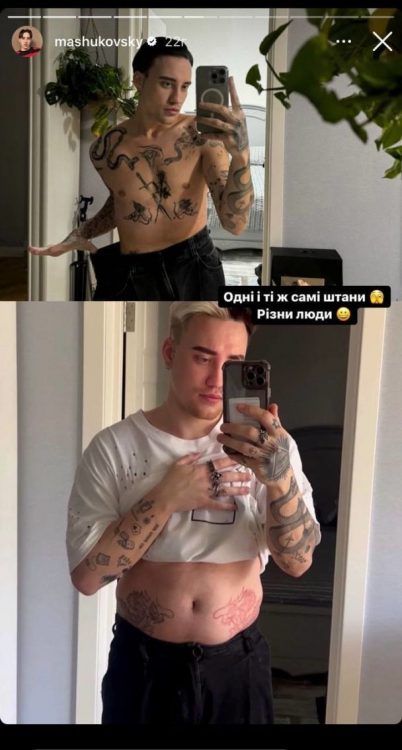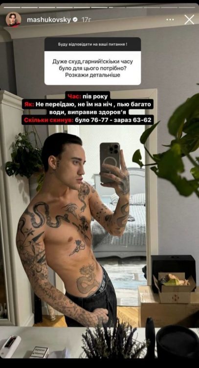 Ефектним результатом він поділився в Instagram-stories. Перед камерою Олег Машуковський продемонстрував підтягнуте тіло. “Час – пів року. Як – не переїдаю, не їм на ніч, п’ю багато води, виправив здоров’я. Скільки скинув: було 76-77 стало 62-63”, – заявив блогер. Також хлопець показав, як виглядав до схуднення.