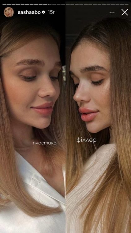 В Instagram-stories блогерка порівняла своє обличчя до та після пластики. Раніше вона збільшувала губи за допомогою ін’єкцій краси. Однак, в один момент Саша Бо вирішила назавжди змінити свою зовнішність. За словами блогерки, губи після пластики їй подобаються набагато більше.