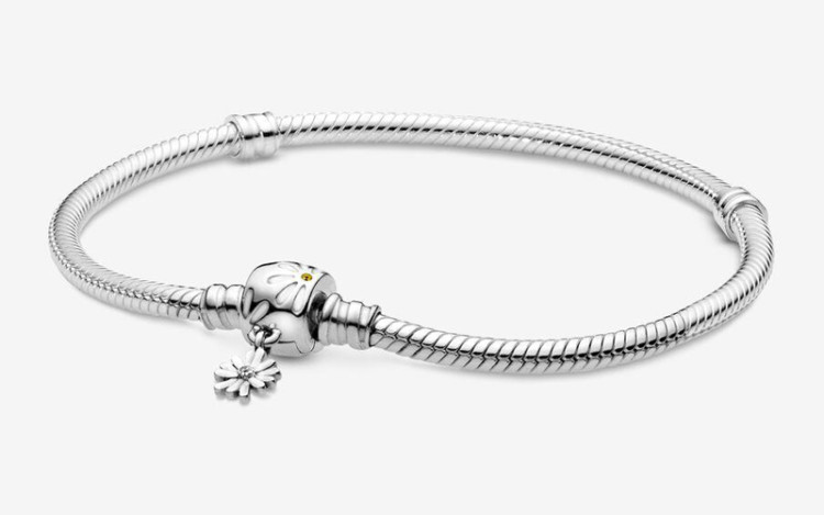 Серебряный браслет с застежкой – неординарное стильное изделие от торгового дома Пандора. Украшение выполнено в форме плотной спирали, которая снабжена оригинальной застежкой, стилизованной под небольшой бочонок. Этот элемент дополнен небольшой подвеской-цветком, сердцевина которого инкрустирована прозрачным кубическим цирконием. Продолжают цветочную тематику белые эмалевые маргаритки с желтыми сердцевинками-кристаллами, расположенными на застежке.