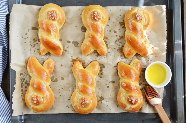 Потім «кроликів» дістають з духовки і змащують розплавленим вершковим маслом. Булочки послужать відмінним доповненням до інших великодніх частувань.