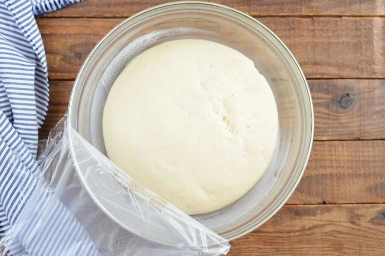 Накривають поліетиленовим пакетом або рушником. Залишають в теплому місці на 60 хвилин. Тісто має збільшитися в об’ємі.