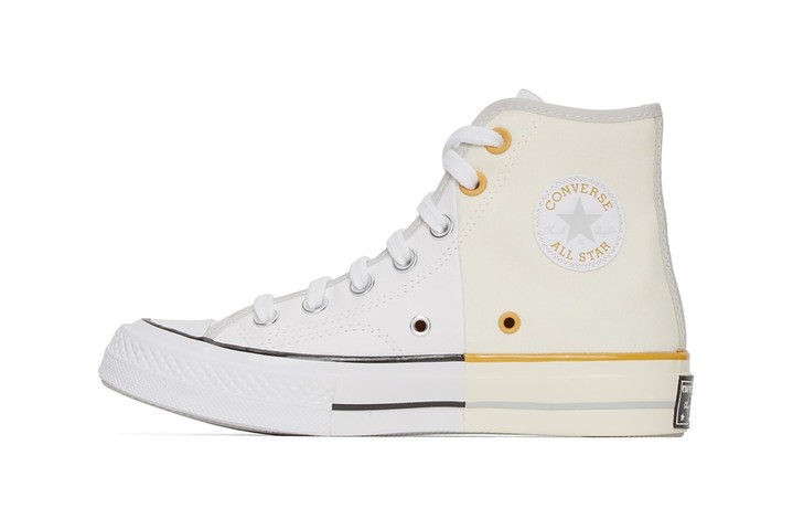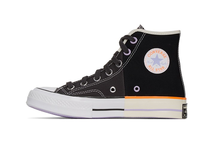 У парі Chuck 70 звичний приглушений чорний колір поєднується з більш насиченим відтінком, лілові люверси замінили частину стандартних металевих, а на підошві з’явилася яскраво-оранжева облямівка. Світлий варіант – це біле полотно в поєднанні з брудно-бежевим, гірчична фурнітура та сіра смуга на підошві.