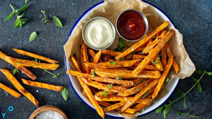 Картоплю фрі подають до столу з будь-яким соусом. За цим рецептом вона виходить по-особливому смачною та з апетитною скоринкою. Картопля фрі швидка у приготуванні та дуже ситна.
