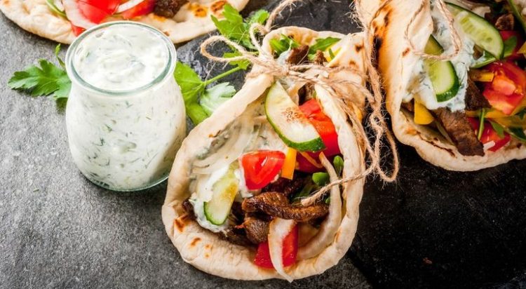 Зелену цибулю дрібно нарізаємо та додаємо до сметани. Туди ж відправляємо подрібнений маринований огірок й часник. Перемішуємо. Піту розрізаємо навпіл та змащуємо соусом.