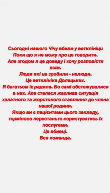 “Сьогодні нашого Чічу вбили у ветклініці. Поки що я не можу про це говорити. Але згодом я це доведу і хочу розповісти всім. Люди які це зробили – нелюди. Я багатьом їх радила. Бо самі обстежувалися в них. Але сталася жахлива ситуація халатного й жорстокого ставлення до члена нашої родини. Якщо ви є пацієнтами цього закладу, терміново припиніть користуватись їхніми послугами. Це вбивці. Вся команда”, – відверто розповіла Даша Астаф’єва.