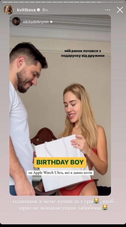 Однак, найпершою його привітала кохана дружина. В Instagram-stories блогерка показала, який коштовний подарунок підготувала для іменинника. За словами Даші Квіткової, вона подарувала чоловіку розумний годинник.