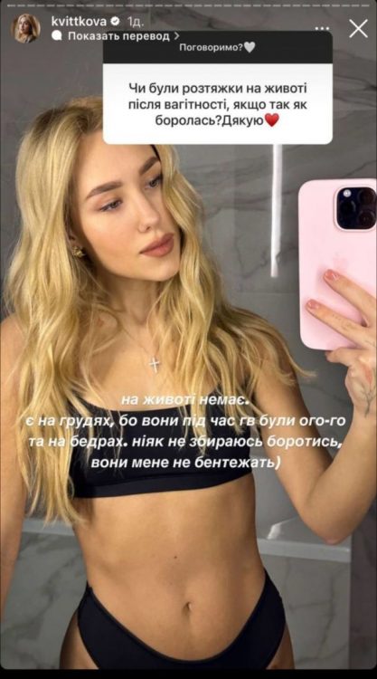 За словами дружини Нікіти Добриніна, вони з’явились після грудного вигодовування. Втім, Даша Квіткова не переймається через розтяжки. Вона любить своє тіло та з кожним днем робить його лише підтягнутішим.