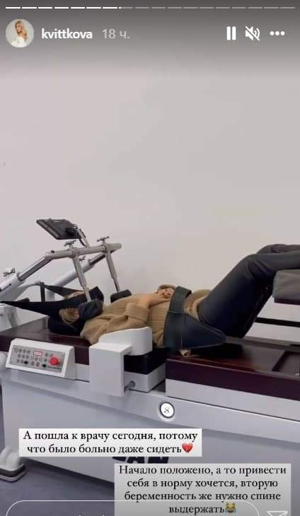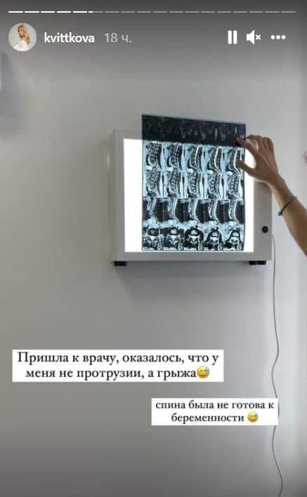 За словами Даші Квіткової, після повного обстеження в її хребті виявили грижу. Подробицями жінка поділилась в Instagram-stories. Вона опублікувала фото, на яких показує результати свого обстеження. Також Даша Квіткова повідомила, що на грижу неабияк вплинула вагітність. Її спина зовсім не була готова до того, щоб виносити малюка.