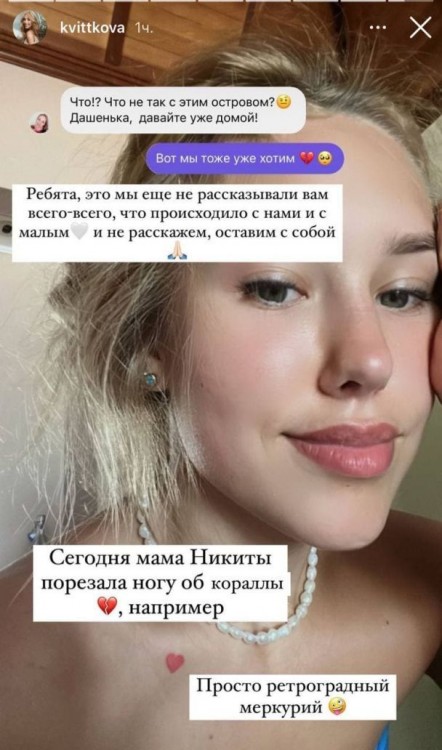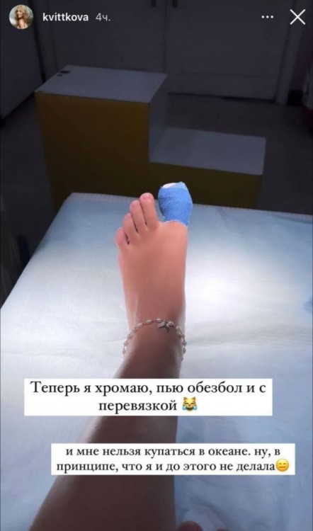Проте, блогерка вирішила не розказувати всіх подробиць. Однак, кохана телеведучого додала, що це не єдина травма, яку вона отримала. За словами Даші Квіткової, жінка випадково порізала ногу об корали.