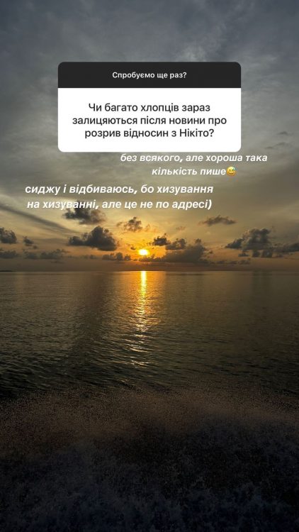 А ще Даша Квіткова зізналась, чи залицяються до неї інші чоловіки після новин про розрив стосунків. За словами блогерки, протягом цього часу з нею намагались познайомитись представники чоловічої статі. Проте, наразі Даша Квіткова не планує заводити нові стосунки.