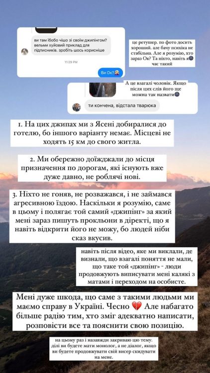 Юзери звинуватили Дашу Квіткову не лише у відпочинку під час війни. Вони висловили величезне обурення щодо джипінгу жінки. Хейтери дорікнули їй, що блогерка руйнує гори позашляховиком.