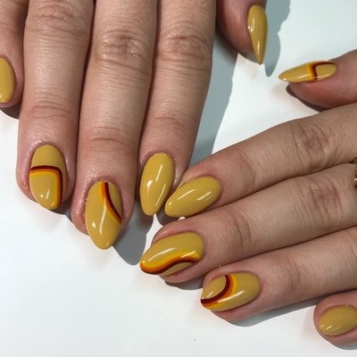 Любителі креативу можуть зробити ретро-манікюр у стилі 70-х. Вибирайте нейтральну базу (наприклад, брудно-жовту) і малюйте однотонну «веселку» з трьох смужок. Найбільш гармонійно виглядатимуть бордові, помаранчеві та гірчичні відтінки.