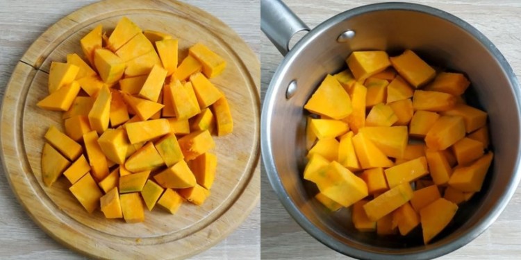 Гарбуз помийте, очистіть від шкірки, волокон і насіння. Наріжте м’якоть на кубики, викладіть у каструлю, влийте 80 мл води і поставте на середній вогонь.