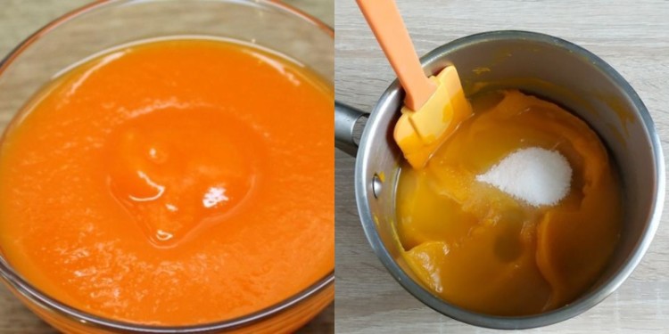 Гарбуз трохи остудіть і подрібніть блендером до однорідної маси без грудочок, додайте лимонний сік і цукор. Перелийте гарбузове пюре знову в каструлю, поставте на невеликий вогонь і проваріть 1 хвилину. Всипте агар-агар, перемішайте і прокип’ятіть ще хвилину, постійно помішуючи.