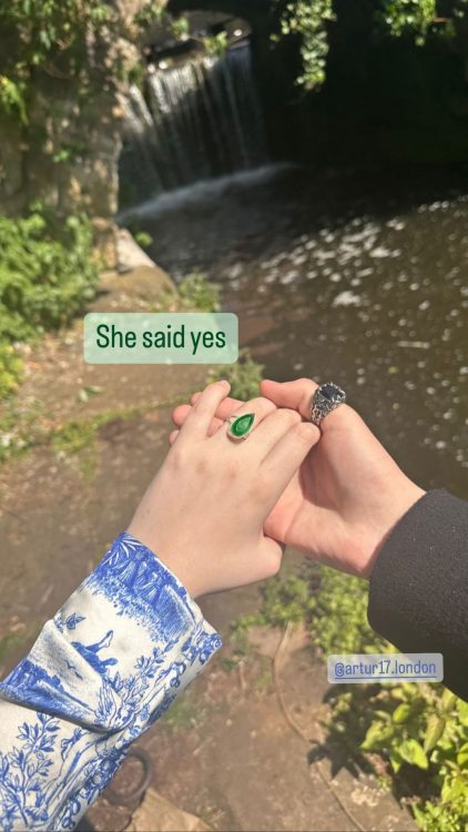 Отож, цього разу Марія знову викликала здивування серед своїх підписників в Instagram, опублікувавши фотографію, на якій видно каблучку на її безіменному пальці. У своїй “Сторіз” вона розмістила знімок, на якому видно її руку, яку тримає її хлопець. На пальці Маші можна помітити масивну каблучку з зеленим камінцем. Вона підписала фотографію словами: “Вона відповіла ‘так'”.