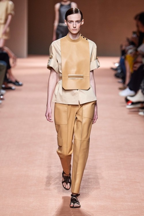 У новому сезоні креативний директор бренду Надеж Вані-Цибульська звернулася до архівних робіт марки, представивши кілька десятків образів зі шкіри: довгі фартухи з високим горлом (їх колись носили кравці будинку Hermès), пальта із застібками, широкі штани з високою посадкою, мінімалістичні топи і вільні сукні а-силуету.