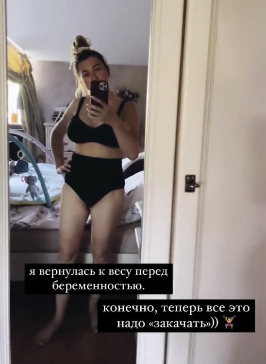 Перед камерою багатодітна мама постала в білизні чорного кольору. За словами жінки, їй вже вдалося повернути вагу, яка була до вагітності. Однак, дружина шоумена планує активно зайнятись спортом й підкачати свої м’язи.