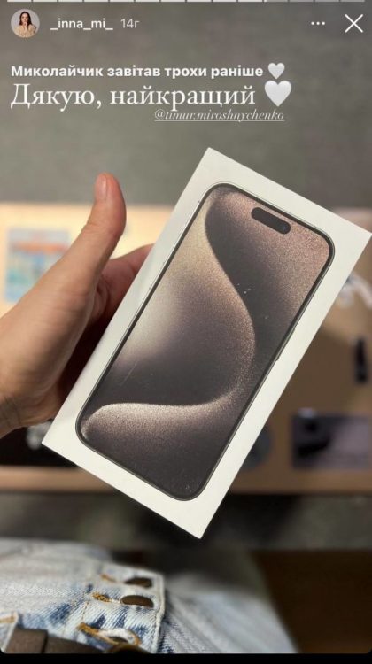 Подробицями Інна Мірошниченко поділилась в соцмережі Instagram. Як виявилось, телеведучий вирішив потішити свою кохану новеньким гаджетом. Тимур Мірошниченко подарував їй iPhone. Такий презент телеведучий вручив дружині з нагоди Дня святого Миколая.