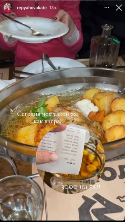 Також концертна директорка розсекретила, в яку суму обійшовся їй обід. Кохана артиста заплатила три тисячі гривень. Проте, в ресторані Катерина Реп’яхова обідала з мамою та друзями, тому така сума грошей вийшла за п’ятьох людей.