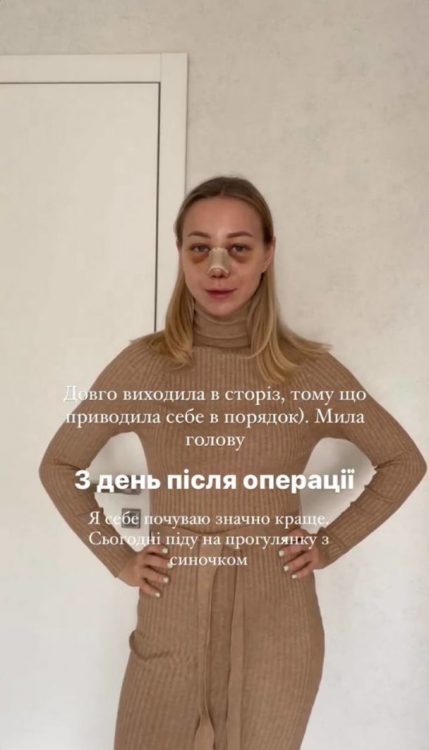 Про це Катерина Реп’яхова розповіла в Instagram-stories. За словами блогерки, на третій день після операції вона почувається значно краще. Однак, дружині Віктора Павліка потрібно ще довго відновлювати сили після хірургічного втручання. Катерина Реп’яхова показала своє обличчя, на якому сильні набряки та помітні синці.
