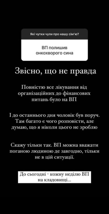В Instagram-stories Катерина Реп’яхова заявила, що артист ні в якому разі не залишав хворого сина перед його смертю. За словами блогерки, Віктор Павлік до останнього залишався поруч з ним.