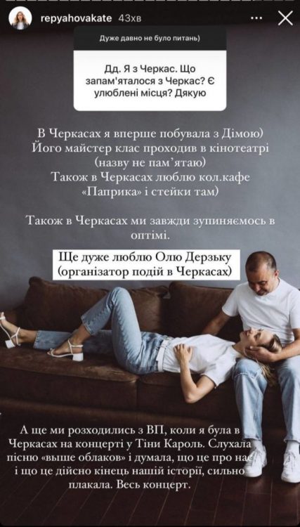 Вона відверто зізналась, що цілий концерт плакала, адже була впевнена, що це кінець їхніх стосунків. На щастя, пара все-таки помирилась. За словами Катерини Реп’яхової, вона назавжди запам’ятала той концерт. Для блогерки цей спогад дуже неприємний.
