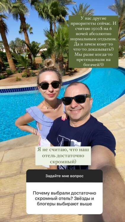 Велика кількість фанів поцікавились, яка вартість відпочинку, на якому знаходиться подружжя. У своїй Instagram-story Катерина Реп’яхова із задоволенням відповіла на це запитання. За словами вагітної, за відпочинок пара заплатила 1500 доларів. Проте, жінка заявила, що за таку суму можна було обрати набагато кращий готель.