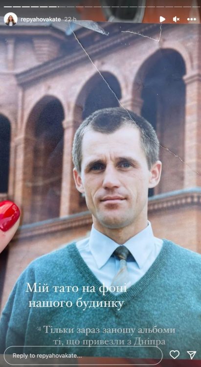 Перед камерою батько Катерини Реп’яхової зображений на тлі будинку в Дніпрі. Він позує у білосніжній сорочці та синьому светрі. На фото батько Катерини Реп’яхової демонструє ледь помітку усмішку. “Мій тато на тлі нашого будинку. Тільки зараз заношу альбоми ті, що привезла з Дніпра”, – прокоментувала архівний кадр дружина Віктора Павліка.
