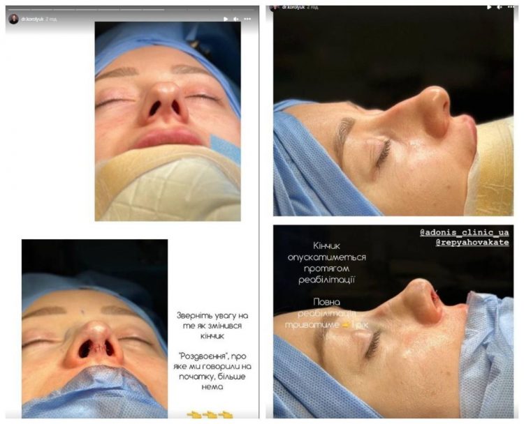 На фото блогерка постала з ідеальним носом. Також вона додала, що реабілітація після операції триватиме протягом року. В Катерини Реп’яхової зникло роздвоєння кінчика носа. Результатом блогерка залишилась дуже задоволена.