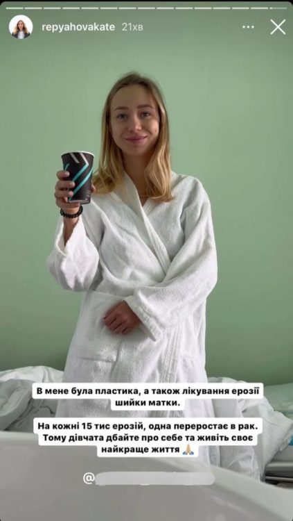 Подробицями Катерина Реп’яхова поділилась в соцмережі Instagram. “Операція тривала майже дві години, мама вже хвилювалася. У мене була пластика, а також лікування ерозії шийки матки. На кожні 15 тис. ерозій одна переростає в рак. Тому, дівчата, дбайте про себе та живіть своє найкраще життя”, – заявила блогерка.