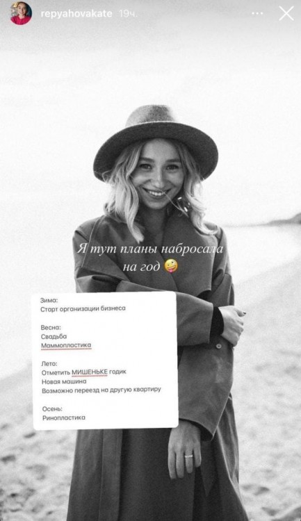 Дружина Віктора Павліка відверто поділилась своїми планами на 2022 рік. В Instagram-stories Катерина Реп’яхова вперше зізналась, що хоче лягти під ніж пластичного хірурга. Жінка планує збільшити бюст та зробити ринопластику.