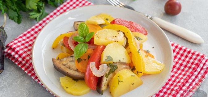 Баклажани, запечені з картоплею, солодким перцем та помідорами